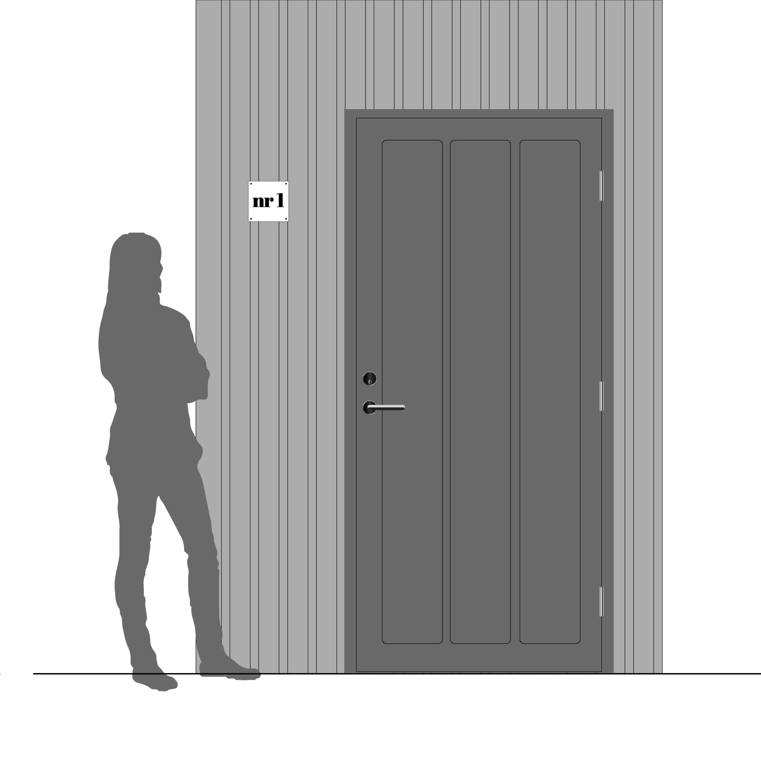 Du fäster skylten enkelt med skruv mot fasad och vägg eller med dubbelhäftande tejp direkt mot en slät dörr.