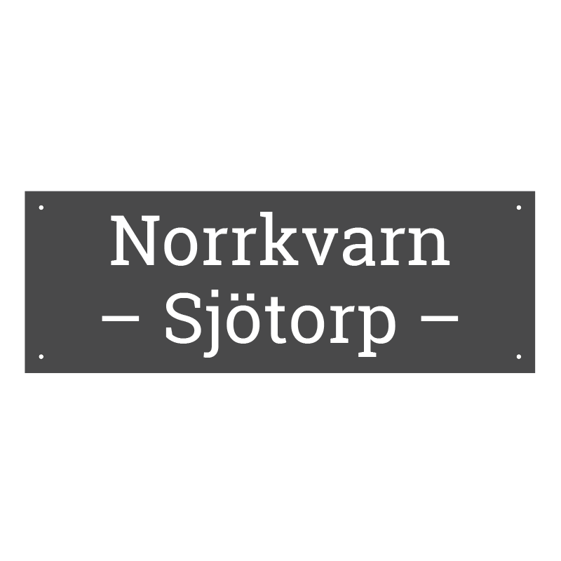 Husskylt 600×210 med vit text. Produceras av 1,5 mm aluminium. Din valda text printas på folie med ett skyddande laminat vilket gör den extra slitstark mot väder och vind. Tack vare det motståndskraftiga materialet passar skylten lika bra utomhus som inomhus.