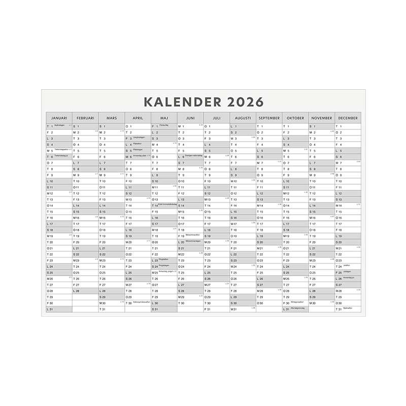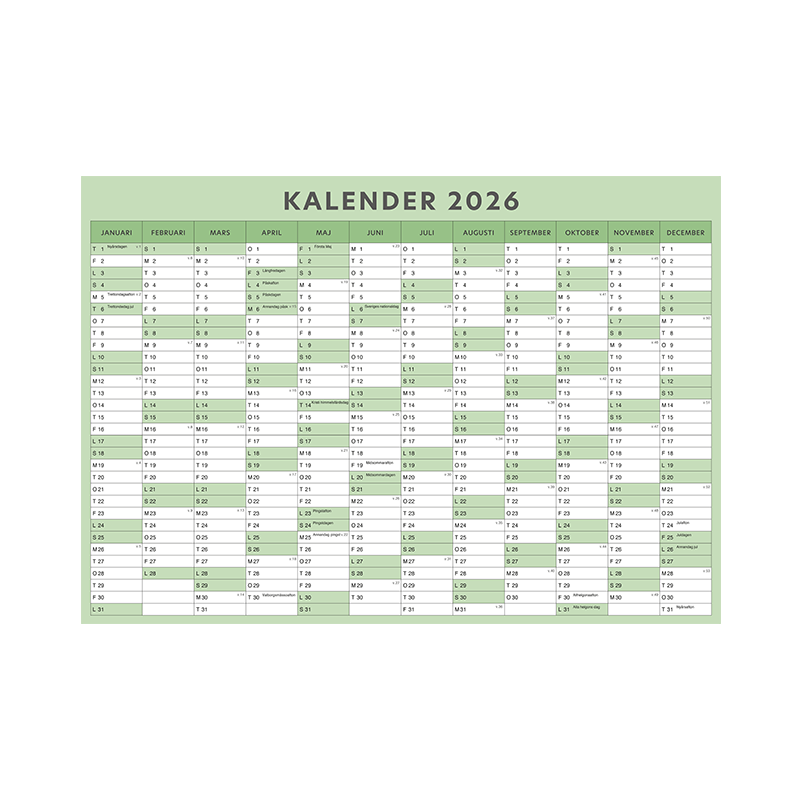 Med denna kalender för 2026 får du en bra översikt över helger, helgdagar och veckor. Med ett praktiskt whiteboardlaminat går det dessutom att göra anteckningar direkt mot ytan med whiteboardpennor.