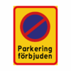 Förbudsskylt med texten ”P-förbud inom hela området” tillverkad av aluminium. Printad normareflekterande reflexfolie mot front.