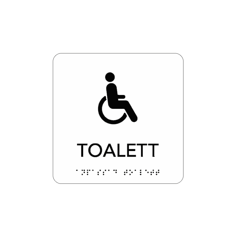 Skylt för ökad tillgänglighet med upphöjd relieftext, punktskrift och symboler. Monteras med dubbelhäftande tejp för applicering på vägg eller dörr.